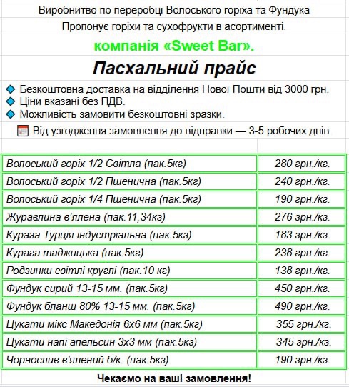 Пасхальний прайс від компанії Sweet Bar: